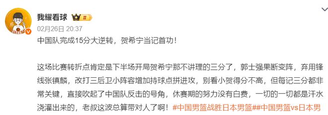 《半岛都市报》、青岛男篮随队记者杜金城赛后也表示,中国男篮这场比赛之所以能逆转,贺希宁、赵继伟两人居功厥伟,这两人就是首功。